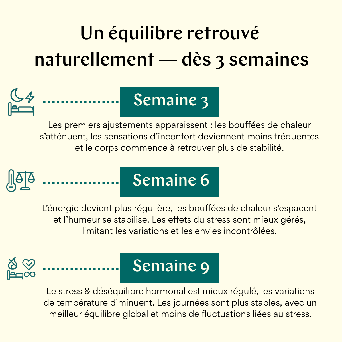 Pour un apaisement durable des bouffées de chaleur et une énergie stabilisée, une cure de 6 à 9 semaines est fortement recommandée.