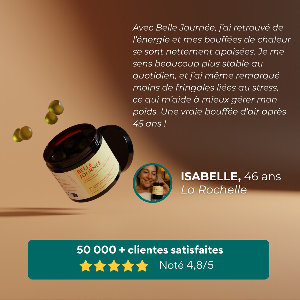 Les plantes et vitamines sélectionnées pour Belle Journée — actée à grappes, sauge officinale, vitamines C et B — sont rigoureusement choisies pour leur efficacité sur les symptômes diurnes de la ménopause. Elles sont travaillées dans notre laboratoire en Auvergne, selon un procédé qui respecte l’intégrité des actifs naturels. Résultat : un complexe végétal et vitaminé qui soutient l’énergie, aide à réduire les bouffées de chaleur et accompagne naturellement le corps vers des journées plus stables, équilibrées et sereines.
