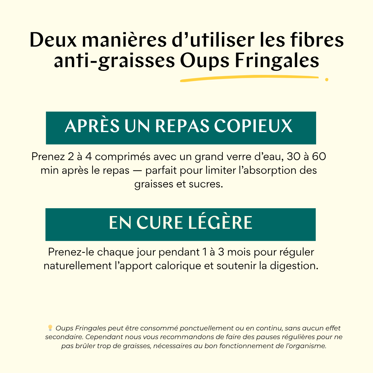 Utilisez Oups Fringales ponctuellement, après un repas copieux ou un écart, pour limiter l’absorption des graisses et sucres et alléger la digestion. - En cure, sur plusieurs mois