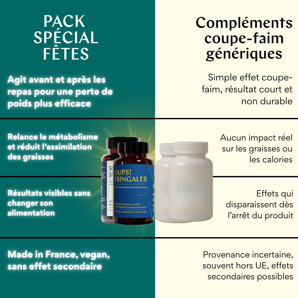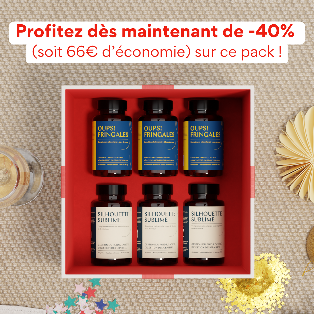 Chaque Pack Spécial Fêtes contient 3 pots d’Oups Fringales (180 comprimés) et 3 pots de Silhouette Sublime (180 gélules), soit environ 3 mois d’utilisation en suivant les dosages recommandés.