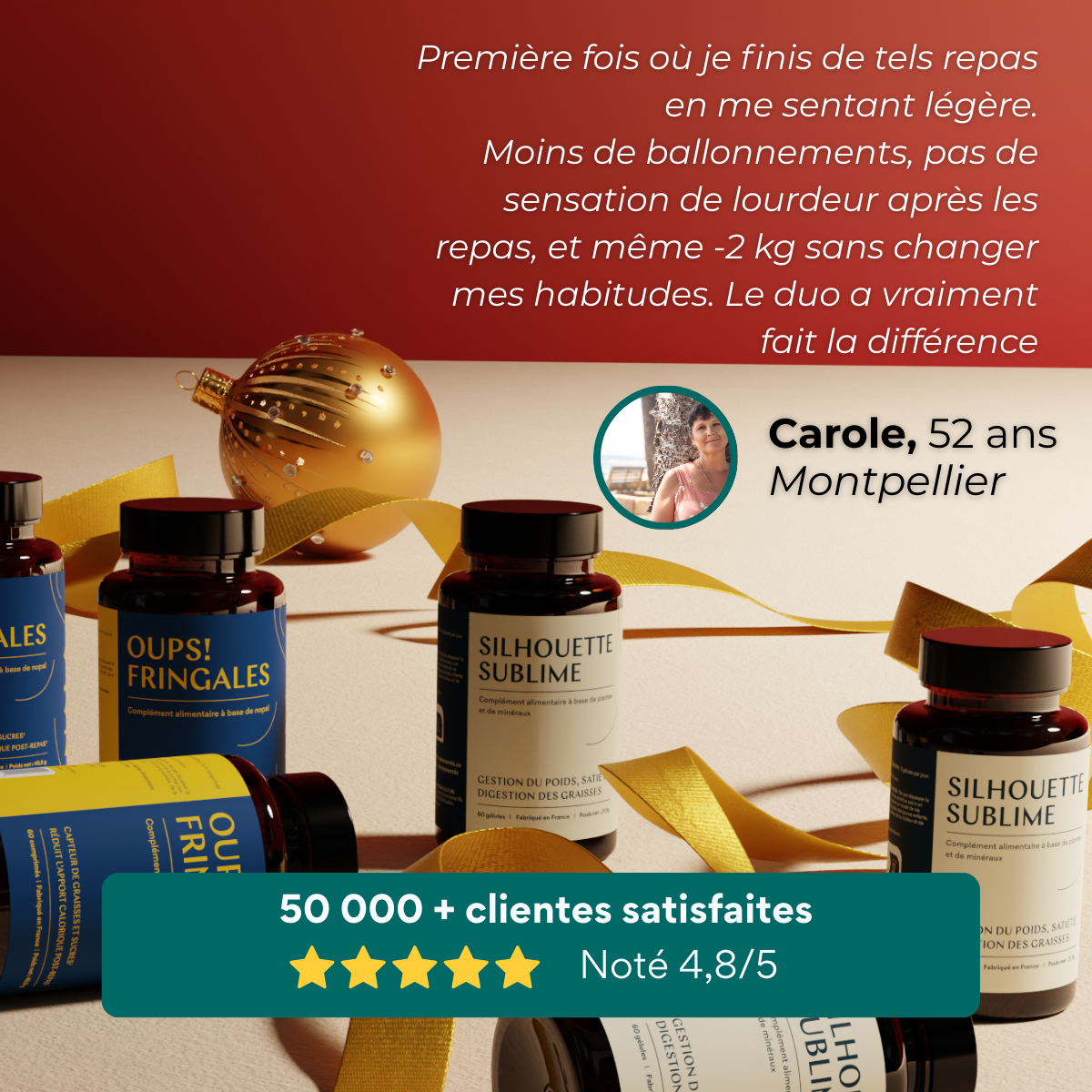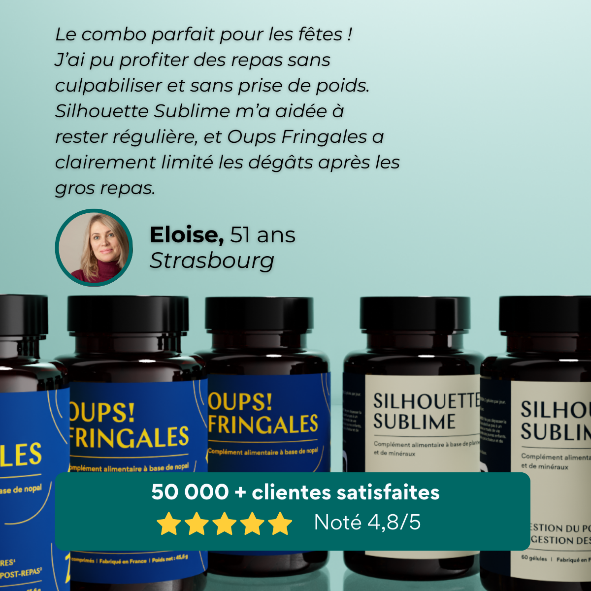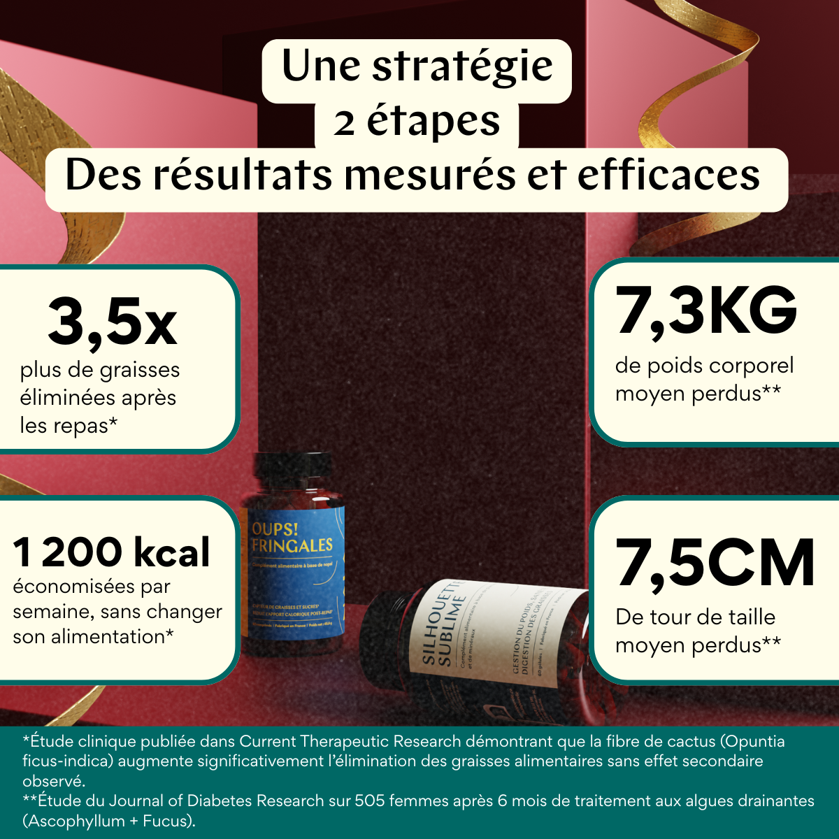 Le Pack Spécial Fêtes associe les algues drainantes de Silhouette Sublime — idéales pour relancer le métabolisme après 45 ans — et les fibres anti-graisses du Nopal, qui captent une partie des graisses et sucres après les repas pour en limiter l’assimilation.