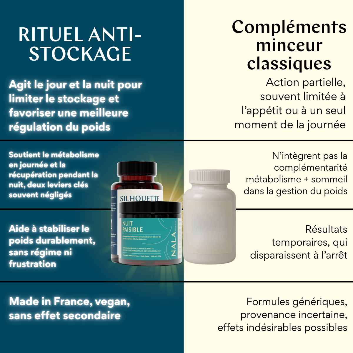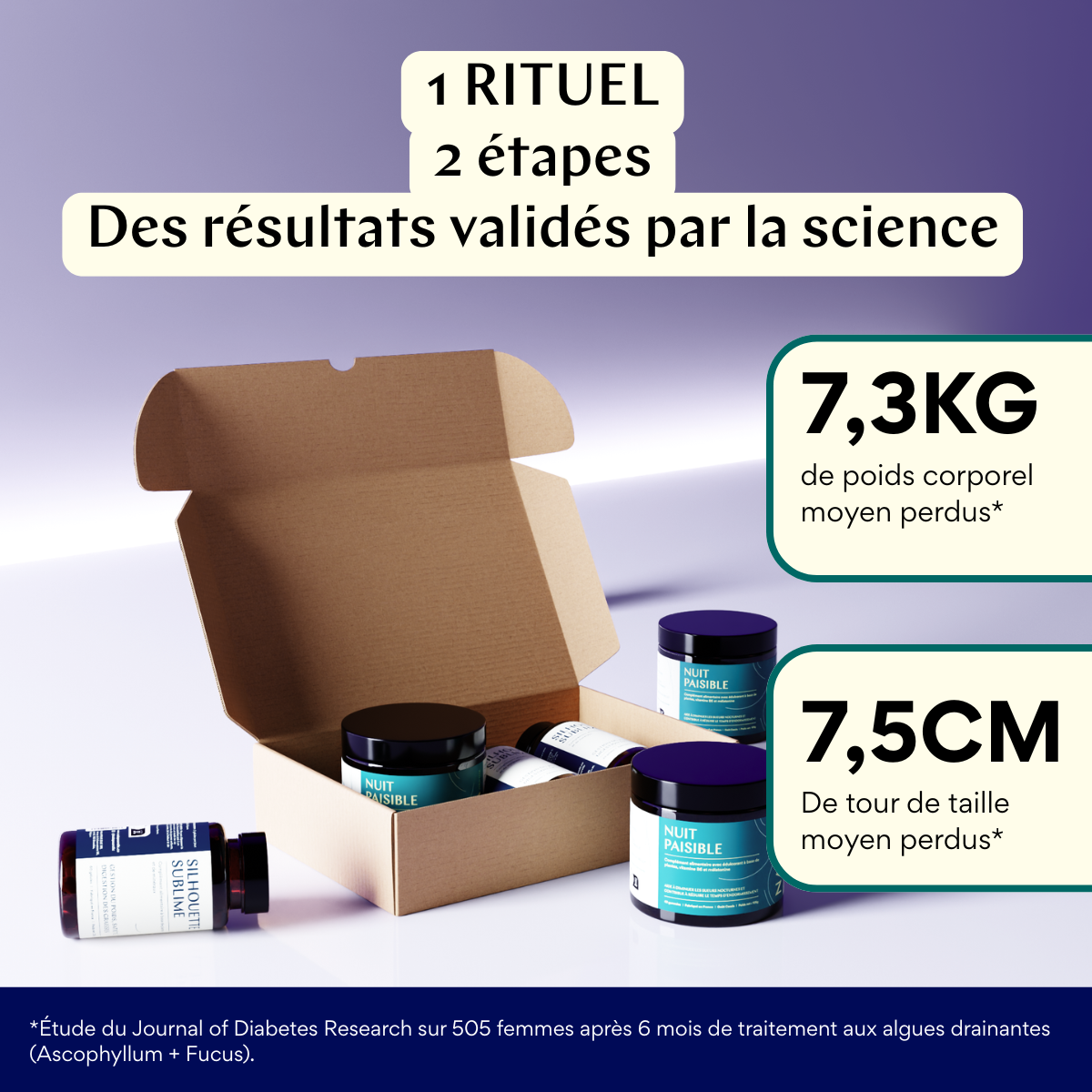 Le Rituel Anti-Stockage associe les algues drainantes de Silhouette Sublime, idéales pour soutenir le métabolisme après 45 ans, et le complexe végétal de Nuit Paisible, conçu pour favoriser un sommeil réparateur et une meilleure régulation nocturne.
