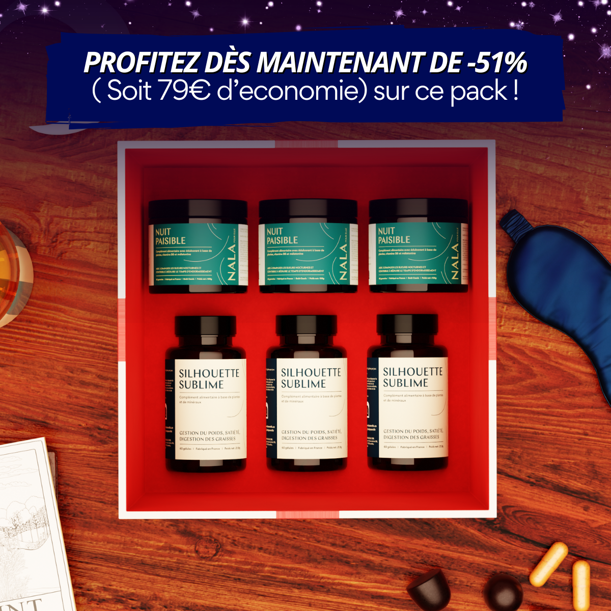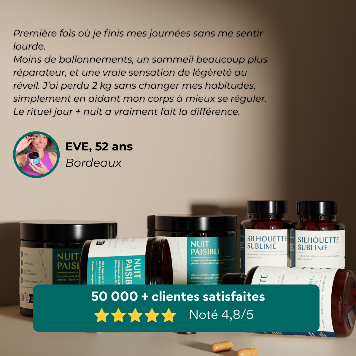Silhouette Sublime : Fucus + Ascophyllum + 4 plantes digestives. Nuit Paisible : une formule dédiée au sommeil et à la récupération. Deux actions en synergie : réguler le jour, récupérer la nuit. Simple, naturel et parfaitement adapté après 45 ans.